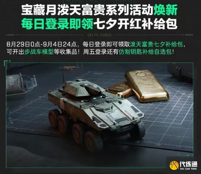 8月29日0點(diǎn)至9月4日24點(diǎn),玩家每日登錄即可領(lǐng)取潑天富貴七夕補(bǔ)給包,可開(kāi)出步戰(zhàn)車(chē)模型等收集品,周五登錄還有仿制鑰匙補(bǔ)給自選包。