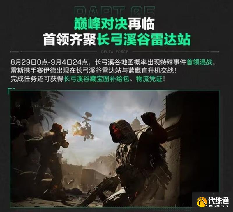 8月29日0點(diǎn)至9月4日24點(diǎn),長(zhǎng)弓溪谷地圖將概率出現(xiàn)特殊事件首領(lǐng)混戰(zhàn),完成任務(wù)后可獲得長(zhǎng)弓溪谷藏寶圖補(bǔ)給包和物流憑證。