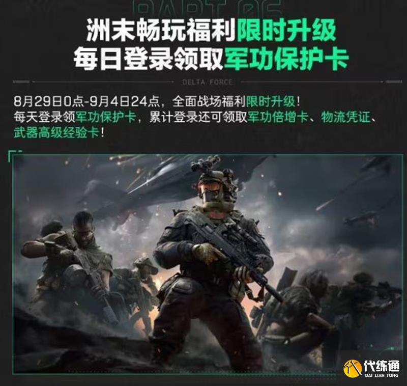 8月29日0點(diǎn)至9月4日24點(diǎn),玩家每天登錄可領(lǐng)取軍功保護(hù)卡,累計(jì)登錄還可領(lǐng)取軍功倍增卡、物流憑證和武器高級(jí)經(jīng)驗(yàn)卡。