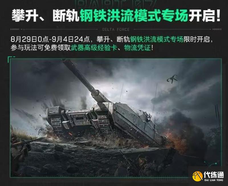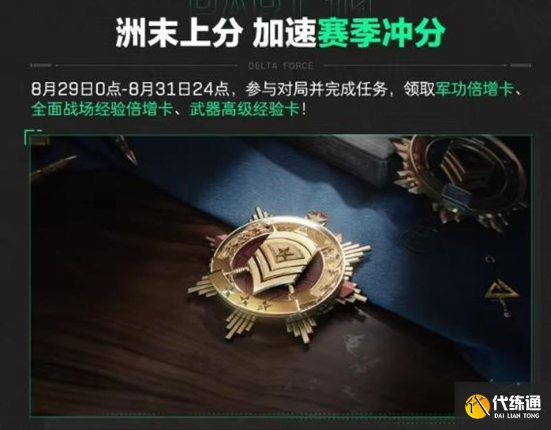 8月29日0點(diǎn)至8月31日24點(diǎn),玩家參與對(duì)局并完成任務(wù),可領(lǐng)取軍功倍增卡、全面戰(zhàn)場(chǎng)經(jīng)驗(yàn)倍增卡和武器高級(jí)經(jīng)驗(yàn)卡。