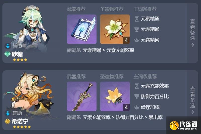 瑪拉妮的武器推薦以提升水元素傷害加成為主,圣遺物則優先選擇元素精通、水元素傷害加成和暴擊傷害等詞條。砂糖的武器和圣遺物推薦以元素精通和元素充能效率為核心,確保能夠快速提供減抗和精通加成。火神的裝備則側重于攻擊力百分比、火元素傷害加成和暴擊率,以最大化后臺火傷輸出。希諾寧的裝備推薦以元素充能效率、防御力百分比和治療加成為主,確保其能夠穩定提供增傷和輔助效果。