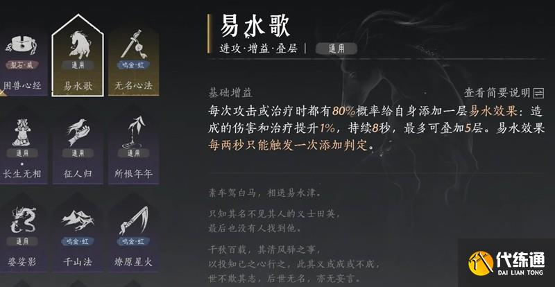 易水歌是游戲中非常受歡迎的一種通用心法,它能夠提升攻擊和治療效果,最多疊加五層。這種心法不僅適用于戰斗,還能在團隊中發揮重要作用。玩家可以在不羨仙的未央城找到商人唐寶,直接購買該心法。