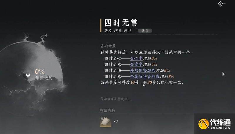 四時無常是一種隨機效果的心法,釋放易武技后可以獲得四種不同的增益效果之一,包括會心率、會意率、外功傷害以及全屬性傷害的提升。雖然效果不確定,但實用性依然很高。玩家可以在大相國寺的曹生書畫鋪找到曹生,購買該心法。