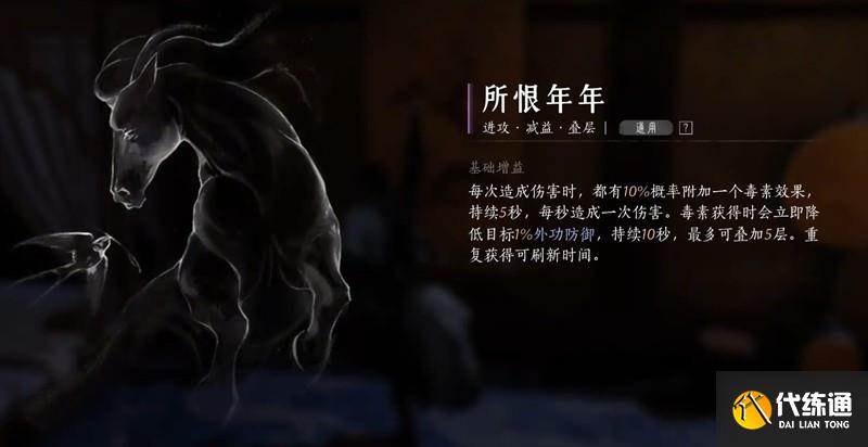 所恨年年在施加毒素的同時還能降低敵人的外功防御,適合配合其他輸出型心法使用。玩家需要先通關無相皇,然后進入柳青衣之墓的隱藏小宮殿,從寶箱中獲取該心法。