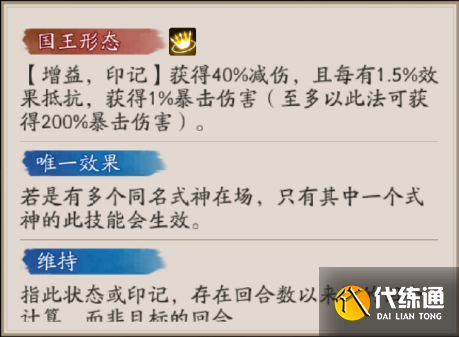 【增益,印記】獲得40%減傷,且每有1.5%效果抵抗,獲得1%暴擊傷害(至多以此法可獲得200%暴擊傷害)。
