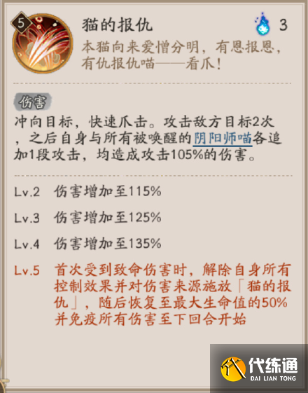 Lv.5 首次受到致命傷害時,解除自身所有控制效果并對傷害來源施放「貓的報仇」,隨后恢復至最大生命值的50%并免疫所有傷害至下回合開始