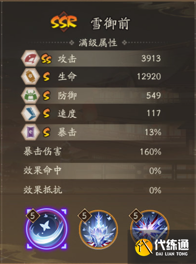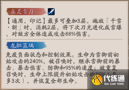 免疫負面狀態和控制效果。生命為雪御前初始攻擊的240%,被召喚時,繼承雪御前的暴擊、暴擊傷害、防御和95%的速度;被重復召喚時,生命上限提升初始攻擊的39%(至多3次),并恢復全部生命。