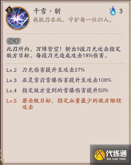 【通用,印記】最多可疊加3層。施放「千雪·斬」時,消耗2層,將下次刀光進化成雪爆,對敵方全體造成攻擊88%傷害。