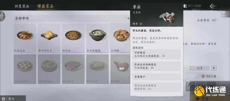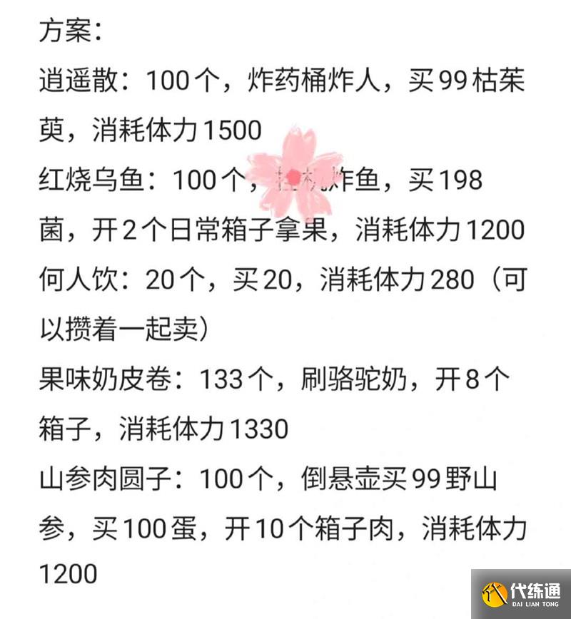 5.山參肉圓子:100個,倒懸壺買99野山參,買100蛋,開10個箱子肉(每周10個箱子,前面開沒了就去雜貨店直接買肉,每份菜多200成本),消耗體力1200
