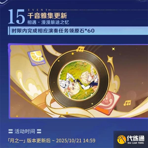 千音雅集更新(至10月21日14:59):新增專輯,完成演奏任務獎勵原石*60