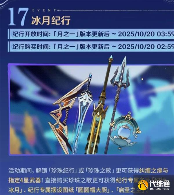 冰月紀行(至10月20日03:59):解鎖珍珠紀行或珍珠之歌獲取糾纏之緣、指定4星武器及專屬獎勵