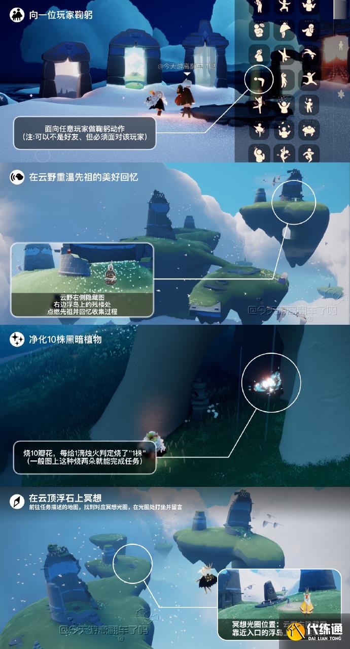 光遇今天的每日任務(wù)刷新在云野,大家知道今天9月11日的具體任務(wù)信息和做法流程嗎?下面為大家?guī)砉庥?.11每日任務(wù)怎么做的具體內(nèi)容和方法,感興趣的玩家們千萬不要錯(cuò)過哦!