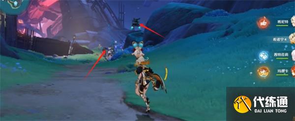 2、從神像出來后右轉,沿著泥路一直走,抵達指定位置會遇到兩只怪物。建議先清理掉左側的愚人眾,以免干擾。
