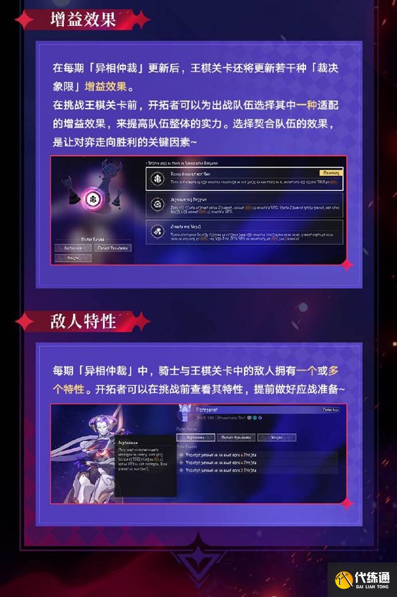 每期異相仲裁中,騎士與王棋關(guān)卡中的敵人擁有一個或多個特性。開拓者可以在挑戰(zhàn)前查看其特性,提前做好應(yīng)戰(zhàn)準備。