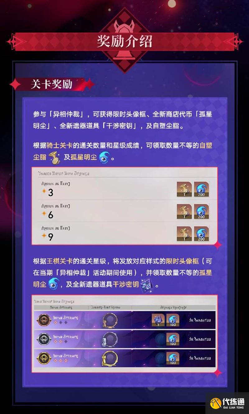 參與異相仲裁,可獲得限時頭像框、全新商店代幣“孤星明塵”、全新遺器道具“干涉密鑰”,及自塑塵脂。根據(jù)騎士關(guān)卡的通關(guān)數(shù)量和星級成績,可領(lǐng)取數(shù)量不等的自塑塵脂及孤星明塵。根據(jù)王棋關(guān)卡的通關(guān)星級,將發(fā)放對應(yīng)樣式的限時頭像框(可在當(dāng)期異相仲裁活動期間使用),并領(lǐng)取數(shù)量不等的孤星明塵,及全新遺器道具干涉密鑰。