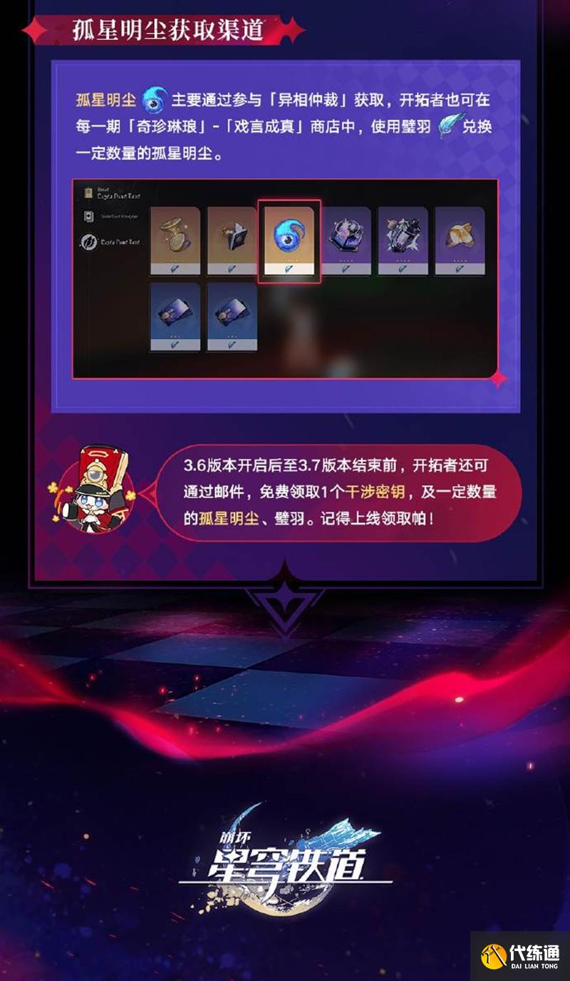 孤星明塵主要通過參與異相仲裁獲取,開拓者也可在每一期“奇珍琳瑯”-“戲言成真”商店中,使用璧羽兌換一定數(shù)量的孤星明塵。3.6版本開啟后至3.7版本結(jié)束前,開拓者還可通過郵件,免費領(lǐng)取1個干涉密鑰,及一定數(shù)量的孤星明塵、璧羽。記得上線領(lǐng)取哦!