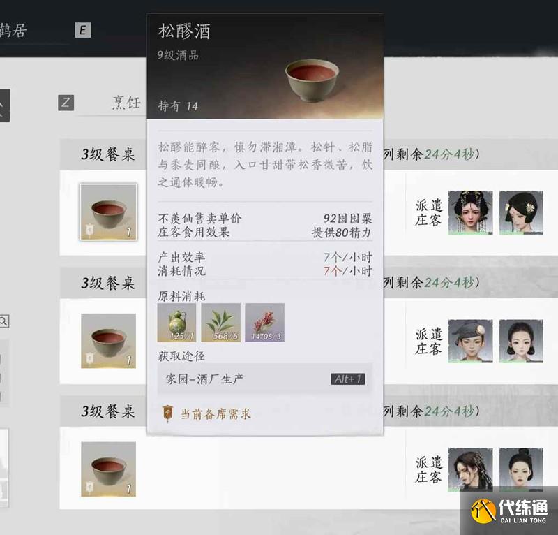 備席:7條松醪酒+1條9級(jí)菜,每條2個(gè)莊客。一定注意賣酒的莊客A等級(jí)+莊客B等級(jí)≤4級(jí),建議采用2級(jí)+2級(jí),消耗百工簿最少,僅需4本。若備席賣酒莊客總等級(jí)超過4級(jí)則必須提高對(duì)應(yīng)的釀酒莊客等級(jí),否則有斷循環(huán)的風(fēng)險(xiǎn)。