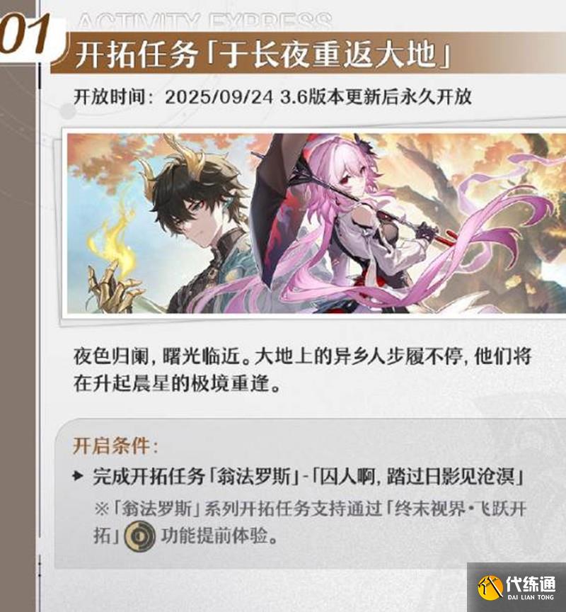 開啟條件:完成開拓任務「翁法羅斯」-「囚人啊,踏過日影見滄溟」。※「翁法羅斯」系列開拓任務支持通過「終末視界·飛躍開拓」功能提前體驗。