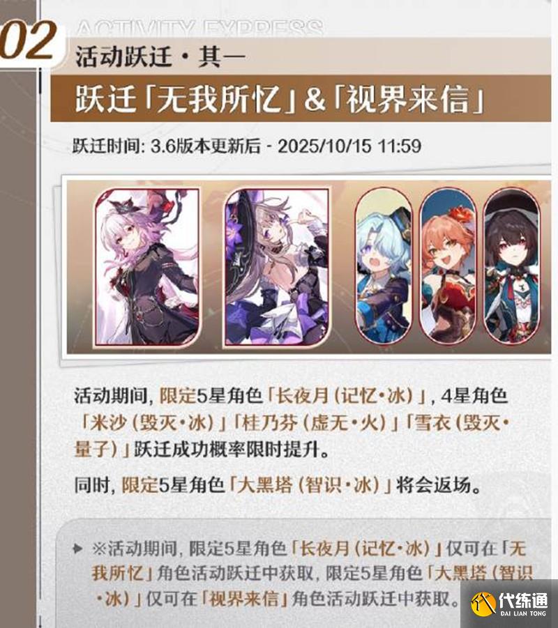 躍遷「無我所憶」&「視界來信」躍遷時間:3.6版本更新后至2025年10月15日11:59。角色信息:限定5星角色「長夜月(記憶·冰)」,4星角色「米沙(毀滅·冰)」、「桂乃芬(虛無·火)」、「雪衣(毀滅·量子)」躍遷成功概率限時提升。同時,限定5星角色「大黑塔(智識·冰)」將會返場。