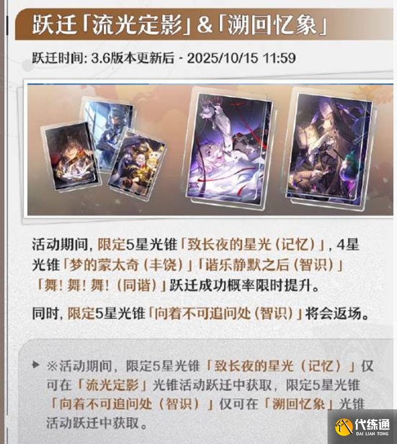 躍遷「流光定影」&「溯回憶象」躍遷時間:3.6版本更新后至2025年10月15日11:59。光錐信息:限定5星光錐「致長夜的星光(記憶)」,4星光錐「夢的蒙太奇(豐饒)」、「諧樂靜默之后(智識)」、「舞!舞!舞!(同諧)」躍遷成功概率限時提升。同時,限定5星光錐「向著不可追問處(智識)」將會返場。