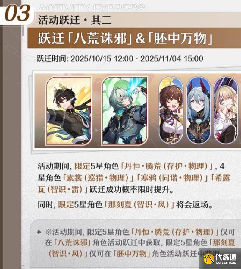 躍遷「八荒誅邪」&「胚中萬物」躍遷時間:2025年10月15日12:00至2025年11月4日15:00。角色信息:限定5星角色「丹恒·騰荒(存護·物理)」,4星角色「素裳(巡獵·物理)」、「寒鴉(同諧·物理)」、「希露瓦(智識·雷)」躍遷成功概率限時提升。同時,限定5星角色「那刻夏(智識·風)」將會返場。