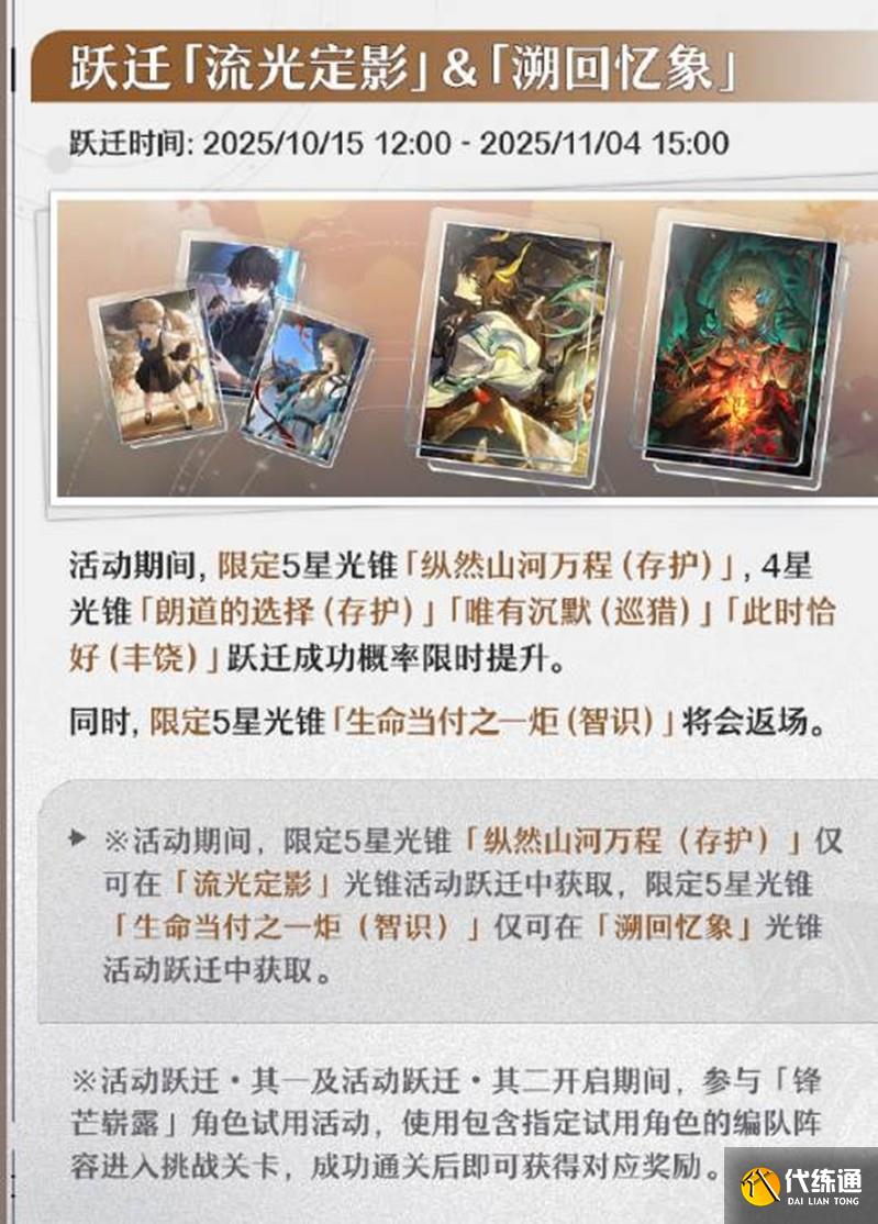 躍遷「流光定影」&「溯回憶象」躍遷時間:2025年10月15日12:00至2025年11月4日15:00。光錐信息:限定5星光錐「縱然山河萬程(存護)」,4星光錐「朗道的選擇(存護)」、「唯有沉默(巡獵)」、「此時恰好(豐饒)」躍遷成功概率限時提升。同時,限定5星光錐「生命當付之一炬(智識)」將會返場。