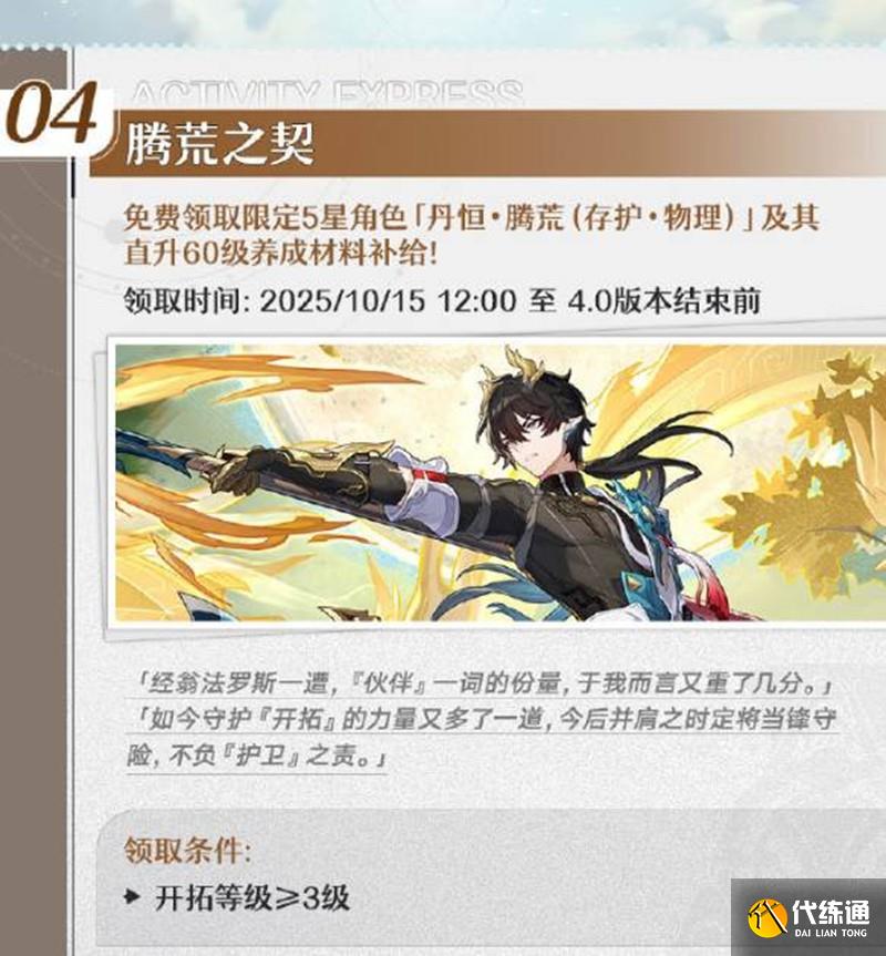 活動描述:免費領取限定5星角色「丹恒·騰荒(存護·物理)」及其直升60級養成材料補給。