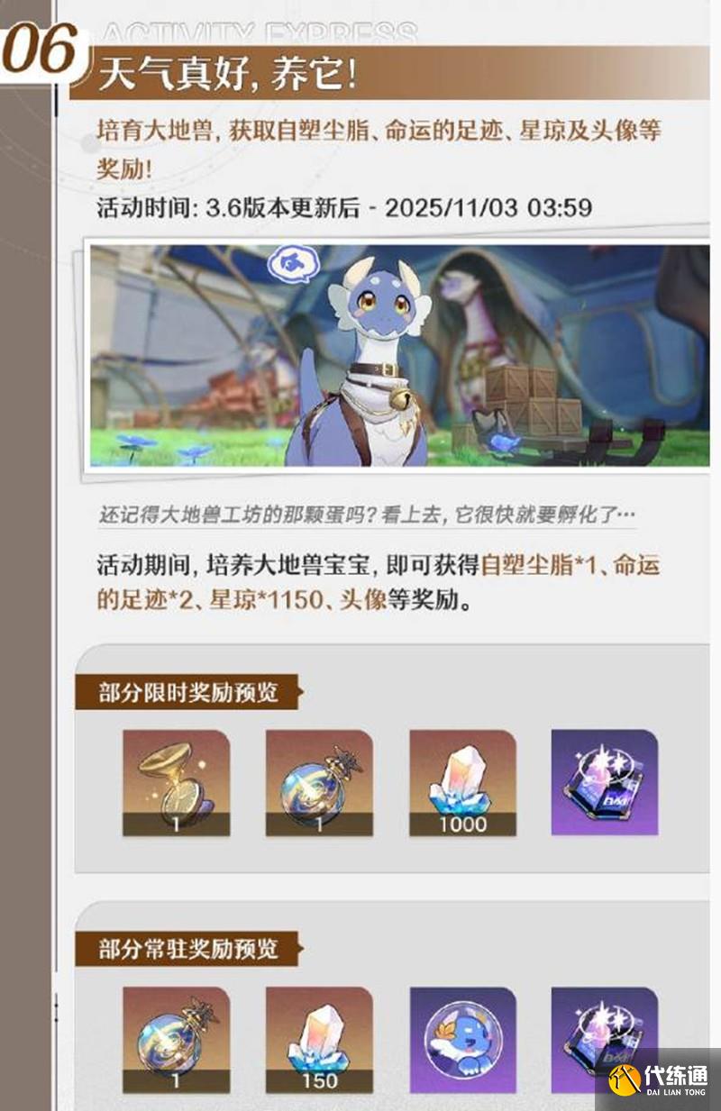 活動描述:培育大地獸,獲取自塑塵脂、命運的足跡、星瓊及頭像等獎勵。