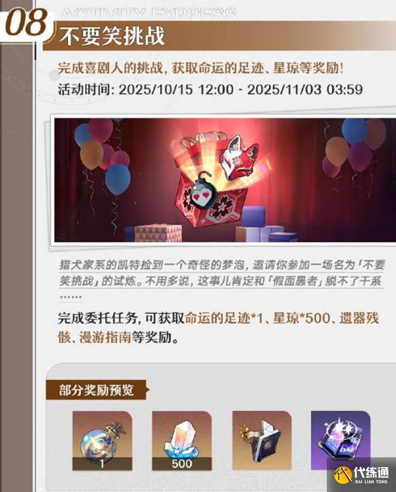 活動描述:完成喜劇人的挑戰,獲取命運的足跡、星瓊等獎勵。