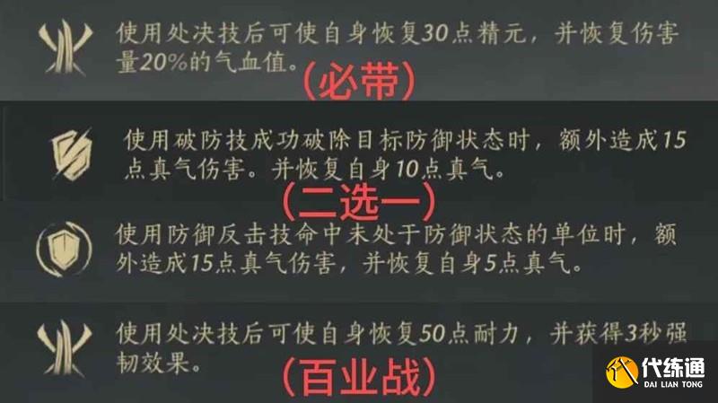 破防技額外造成15點真氣傷害+恢復5點真氣、格反額外造成15點真氣傷害+恢復5點真氣,二選一(百業戰處決恢復耐力+3秒強韌)