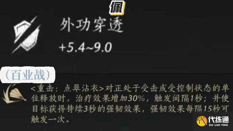 佩:外功穿透(百葉戰<重擊·點翠沾衣>給予受擊或受控制目標強韌效果)