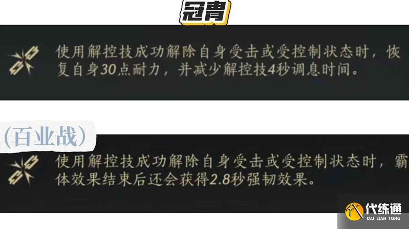 冠胄:解控后恢復30點耐力+減少4秒解控CD(百葉戰解控后獲得2.8秒霸體)