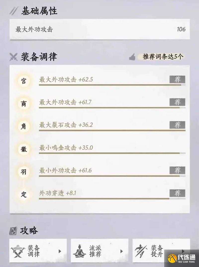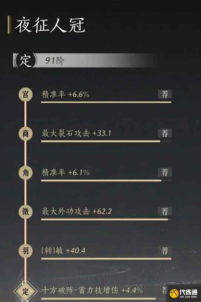 舉個例子,你裝備A之前幾個調律都很順。會心率,大外,勁,最大裂石都有了,你玩陌刀的,就怕下一個出個最大破竹。