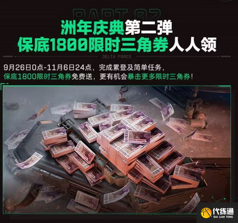 9月26日至11月6日,完成累計及簡單任務(wù),保底1800限時三角券免費(fèi)送。