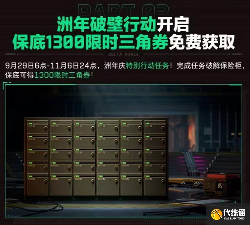 9月29日至11月6日,完成洲年慶特別行動任務(wù),破解保險柜,保底可得1300限時三角券。