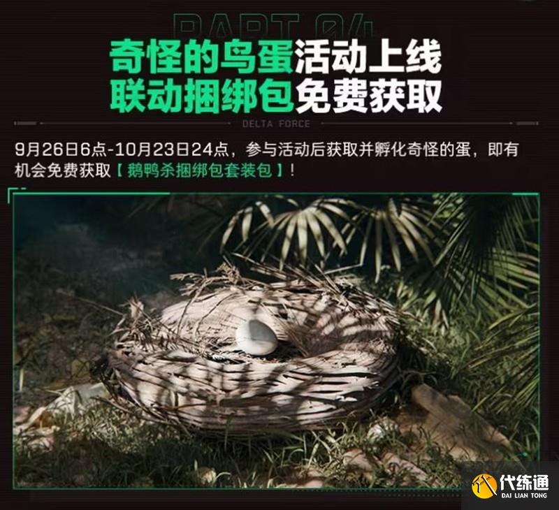 9月26日至10月23日,在烽火地帶各地圖中的鳥窩將有概率掉落奇怪的蛋與黃金鳥蛋。