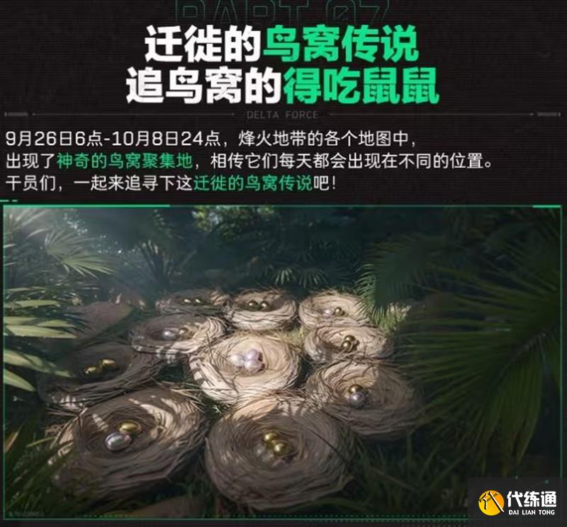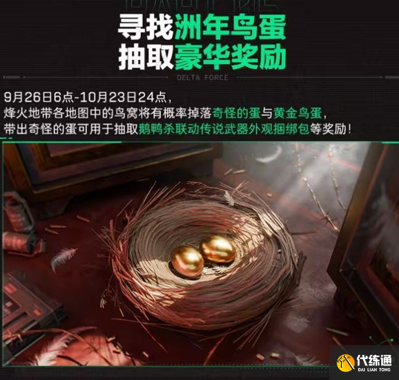 9月26日至10月23日,在烽火地帶各地圖中的鳥窩將有概率掉落奇怪的蛋與黃金鳥蛋。
