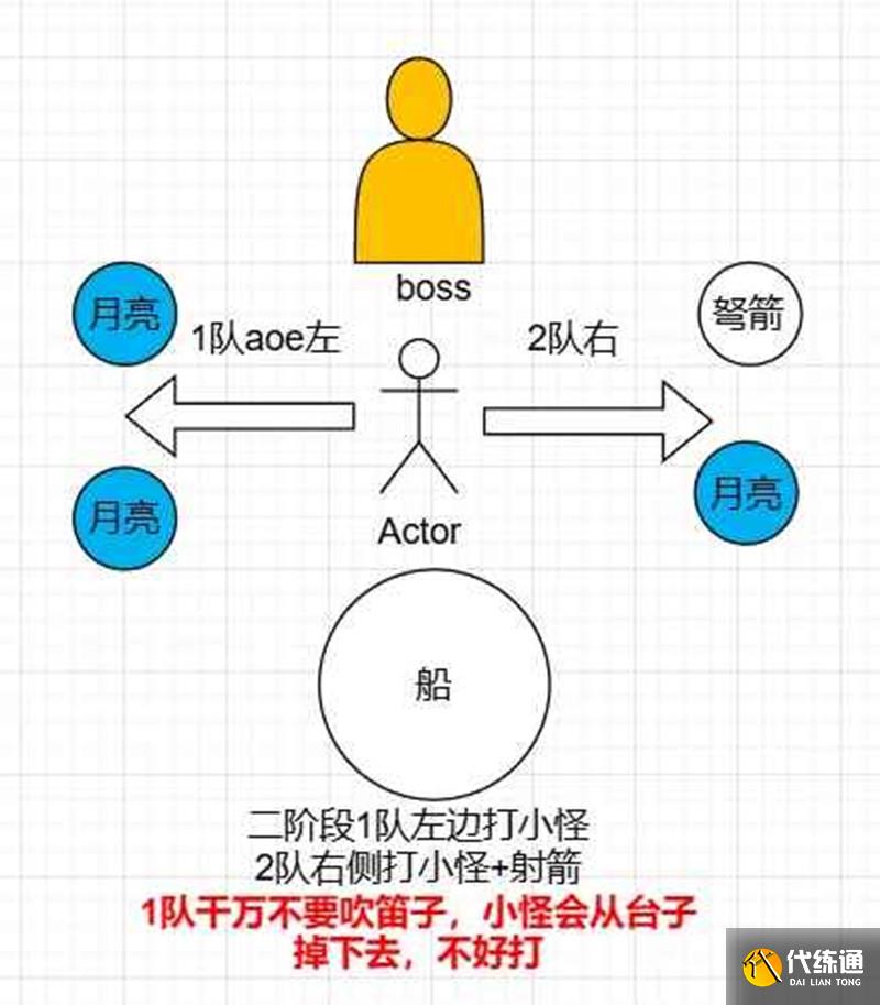 1、 此時(shí)全隊(duì)分為左右兩隊(duì),面對(duì)新boss左側(cè)去aoe打小怪,右側(cè)去塔樓打小怪和射弩箭船上的鳥(niǎo)