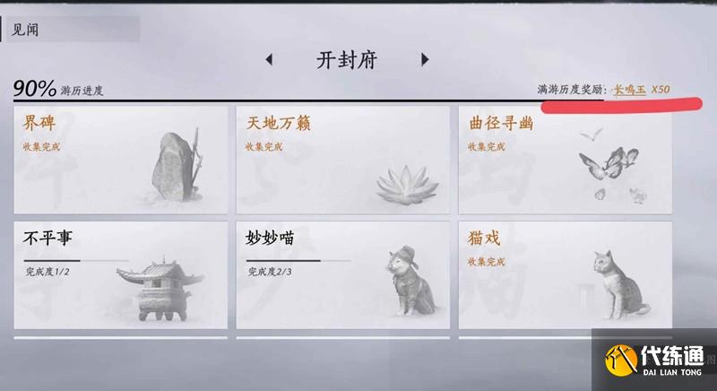 另外眾生探索度90%以上的地區(qū)可以肝一下,達100%有區(qū)域獎勵拿,你可能差的就是一個貓戲或者射覆。長鳴玉清河20,開封50,河西80,比全地圖只找寶箱快得多。