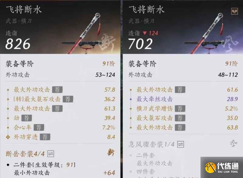 左邊四件:唐刀/陌刀增傷,雙大外+勁/敏+會心+全武增最佳定音外功穿透,不要無相只能過渡