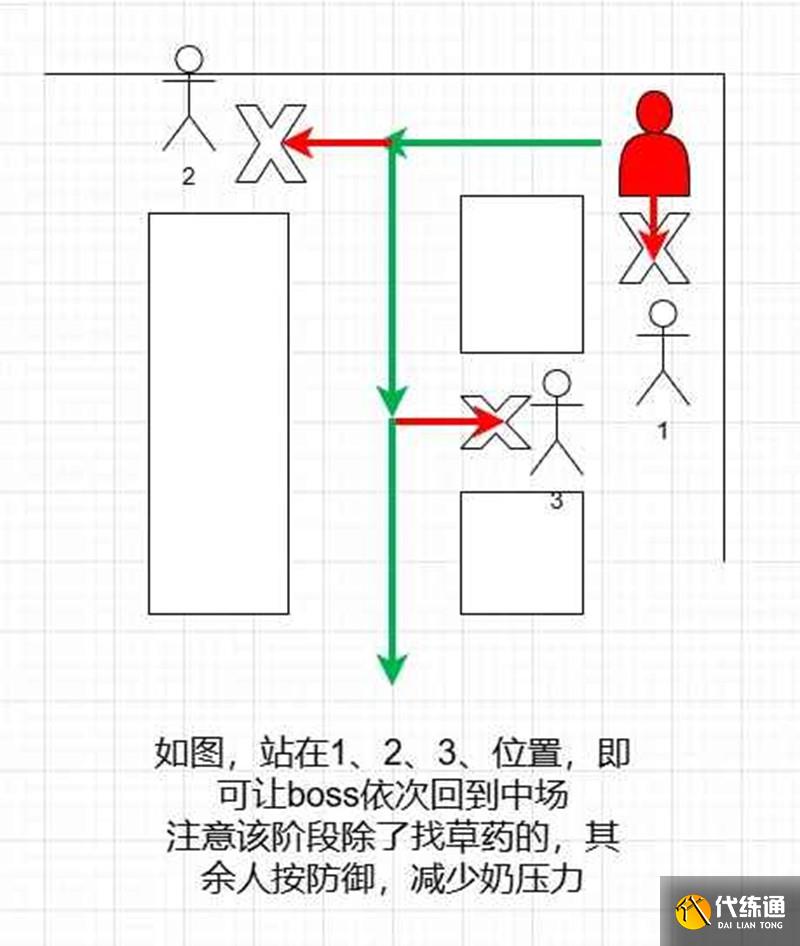 2、 打一會兒boss會跑四周角落,類似抓蹊蹺,看好馬跑的方向,堵住其他方向,讓馬跑回中場,最多2個人堵路就夠(按防御減傷),其他的人可以去找草藥回血,擋馬階段boss出紅線卸勢即可