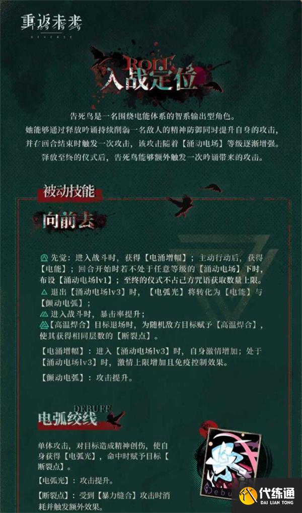 洞悉-電場(chǎng)機(jī)制:三級(jí)電場(chǎng)提升激情上限并免疫控制,結(jié)束時(shí)會(huì)將自拐[電弧光]轉(zhuǎn)化為[電能]與[顫動(dòng)電弧],均能提升攻擊。