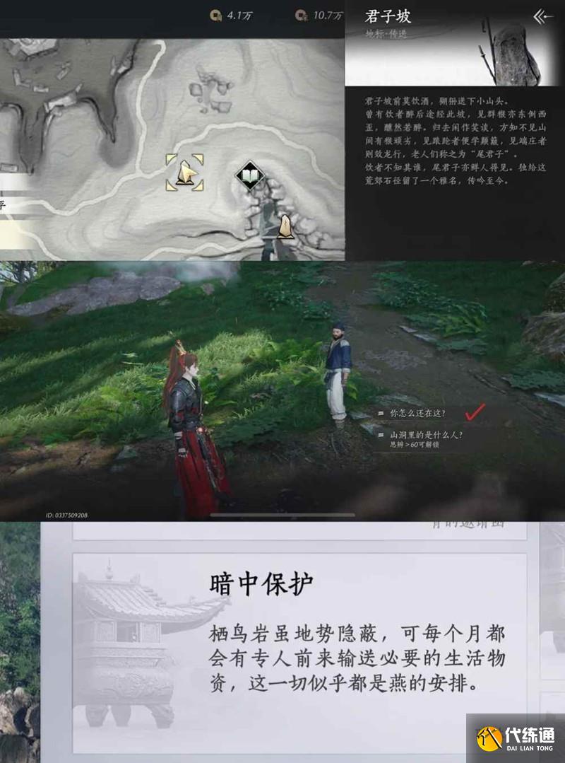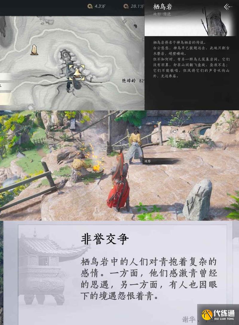觀察結束,原地大輕功飛上山頂(先大輕功一段到圖中書閣位置,再大輕功一段上山頂),偷聽NPC白云黑巖的對話