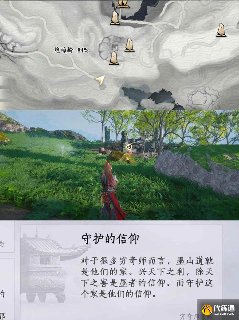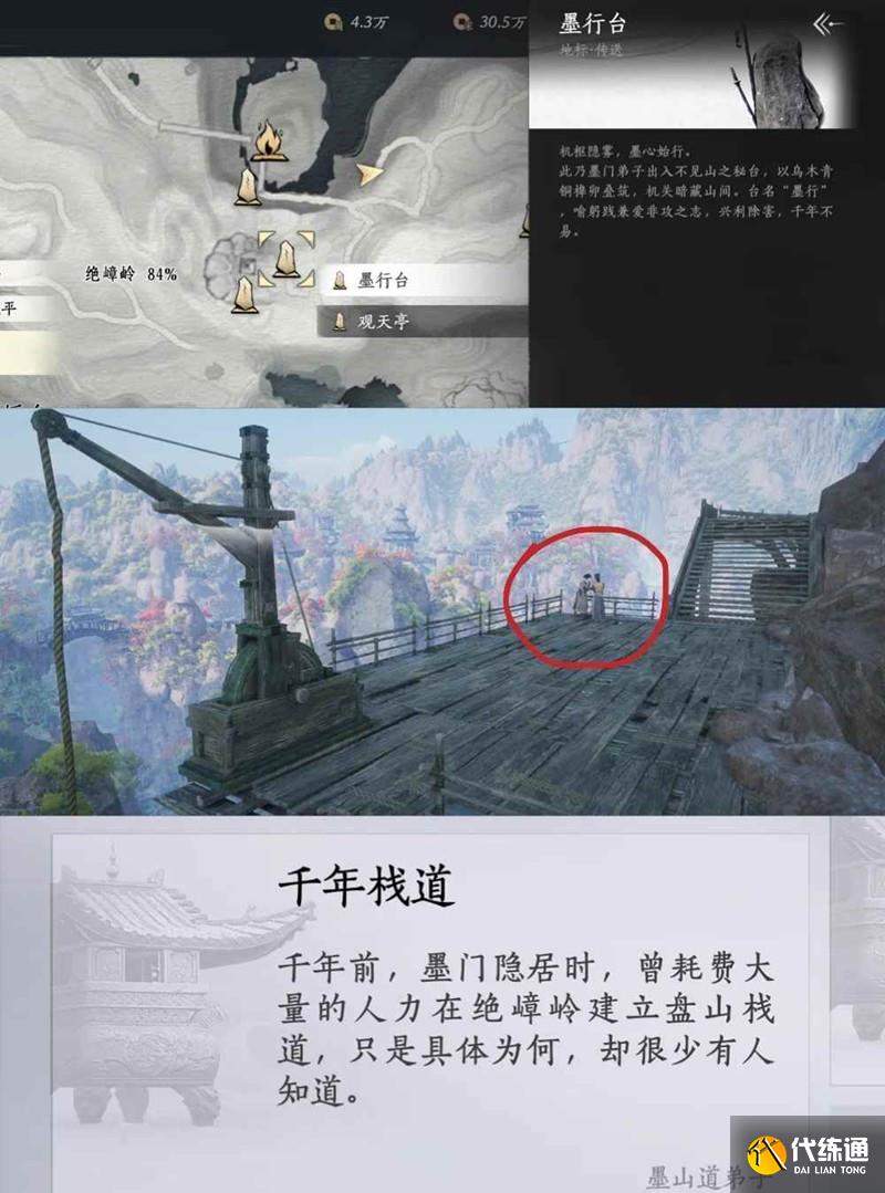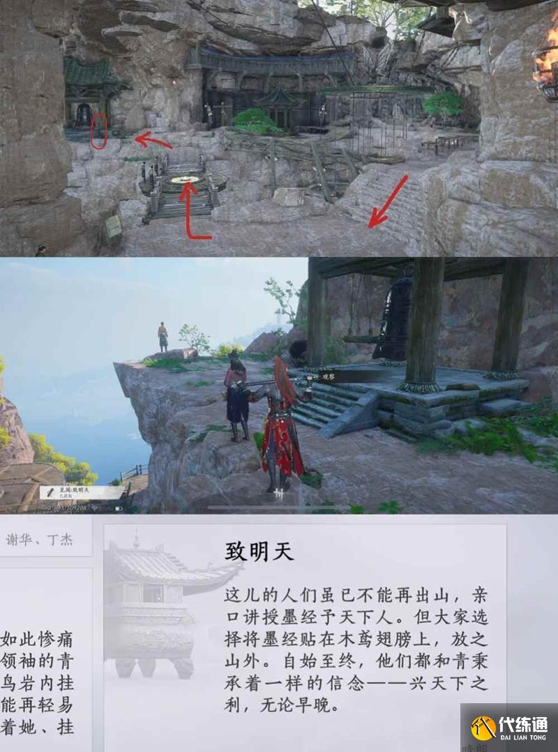 傳送墨行臺界碑,順著右邊的上山小路一直走,過破破爛爛的棧橋(有一個墨山道弟子在修路),上懸撞,落地后能看到兩個竊竊私語的墨山道弟子,過去對話即可