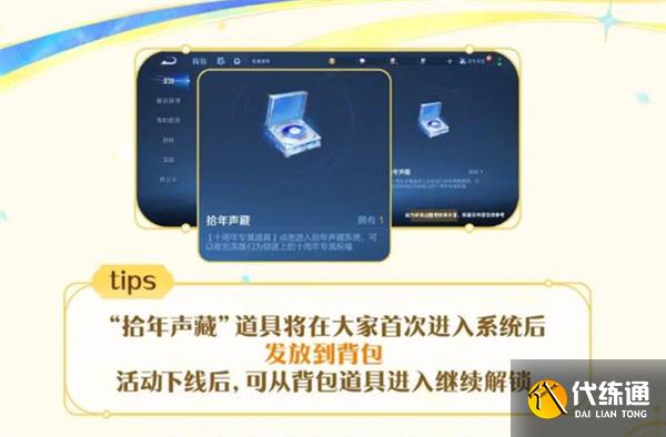 玩家首次進入活動系統后,“拾年聲藏”道具將自動發放至背包。