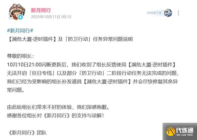 10月10日21:00閃斷更新后,我們收到了組長反饋使用【瀕危大廈·逆時插件】無法開啟「往日專線」以及部分「防衛行動」二階段行動任務無法完成的問題,我們已經為受影響的組長補發道具【瀕危大廈·逆時插件】并會盡快修復其余異常問題。