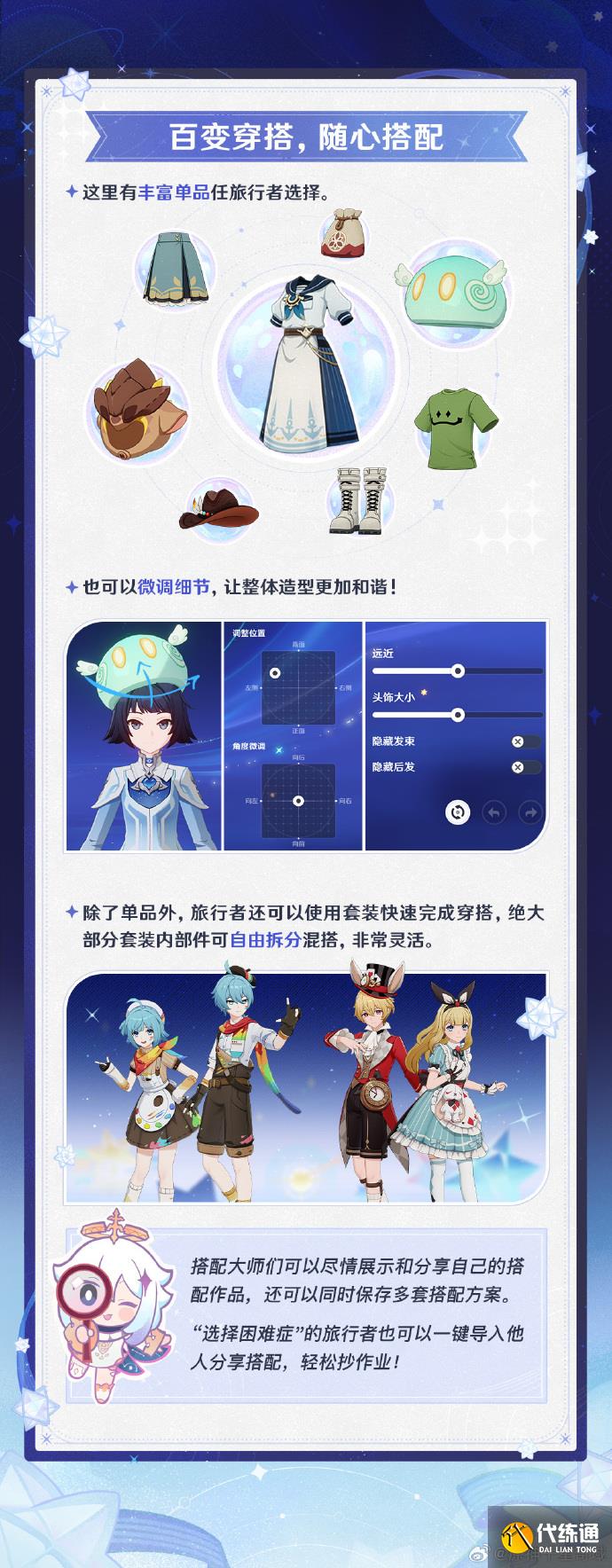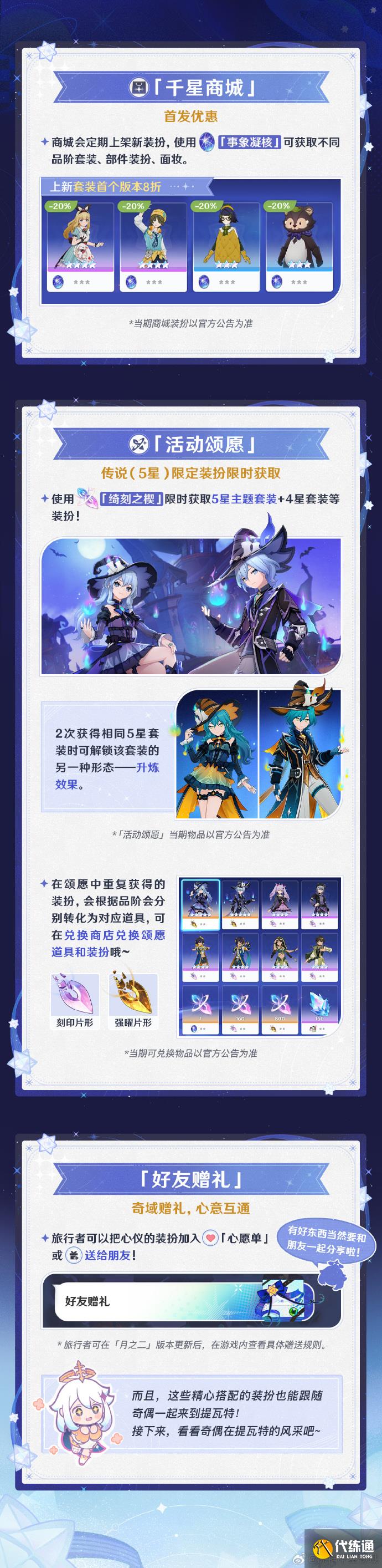 旅行者可以通過「頌愿」、「紀游」、「商城」等途徑獲取不同品階的裝扮:傳說 卓越 優異 精良。
