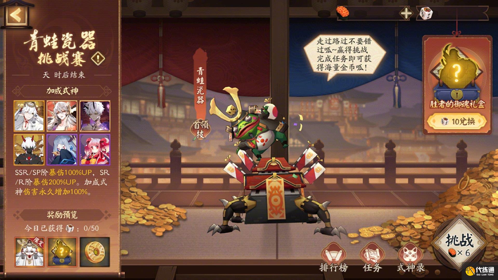 每日消耗體力參與挑戰,獲勝后將獲得「神秘骰子」,可用于兌換「勝者的御魂禮盒」,完成挑戰任務還可獲得大量金幣及活動限定表情包「可靠」!