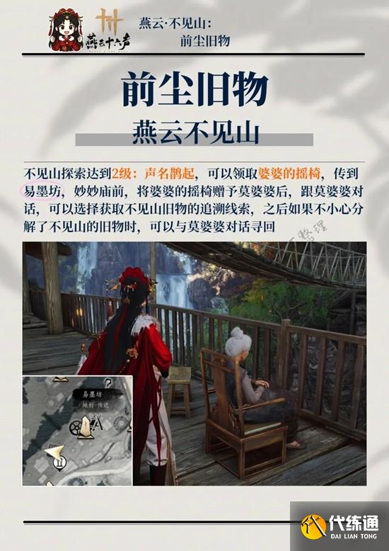 不見山探索達到2級:聲名鵲起,可以領取婆婆的搖椅,傳到易墨坊,妙妙廟前,將婆婆的搖椅贈予莫婆婆后,跟莫婆婆對話,可以選擇獲取不見山舊物的追溯線索