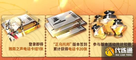 登錄游戲即可獲得“雅南之聲”電話卡組1張。此外,“正烏托邦”版本簽到累計可獲得電話卡20張。參與版本活動共計可獲得超相塵6120個。